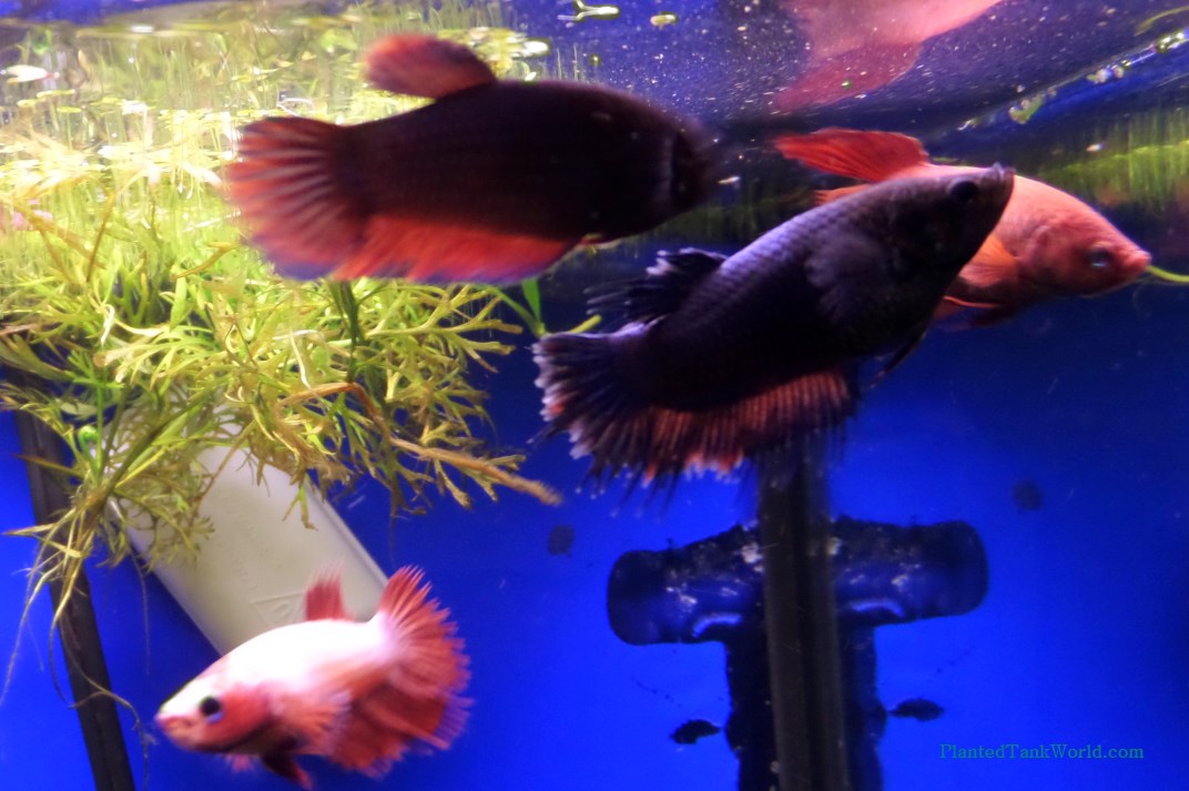 This tank has four bettas, all seen together in the above photo. At the beginning of the week there had been five. The fifth was my first female betta, who I purchased when rather old and full-grown. She was the ruler of the tank, keeping the order among the sorority. When she passed, the remaining four bettas were left to establish a new hierarchy.